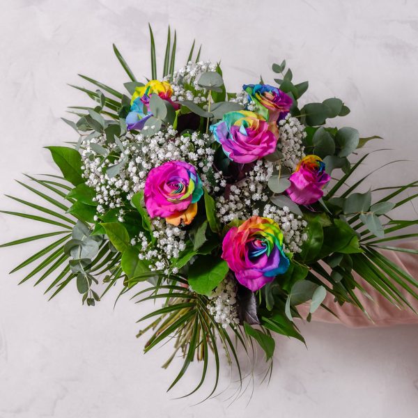 six stunning multicoloured roses, accompanied by: